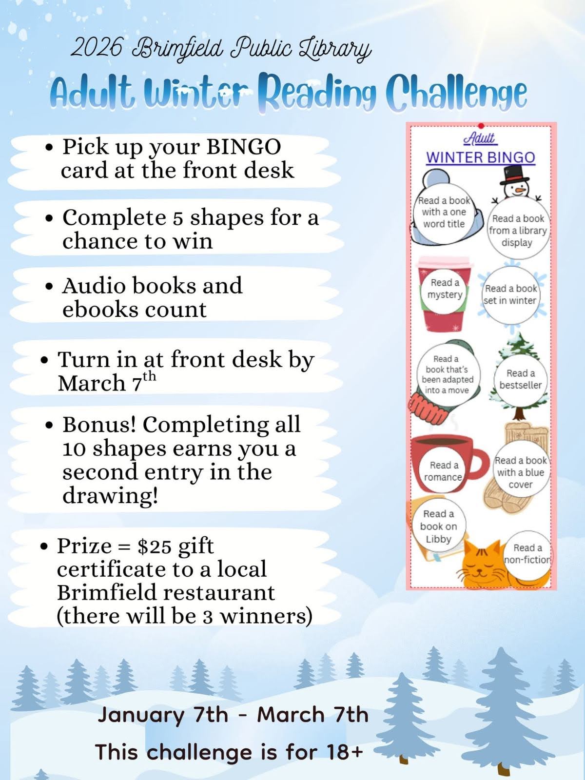 Our first-ever Adult Winter Reading Challenge begins on Wednesday January 7th! Start 2026 off on the right foot by working towards your reading goals!