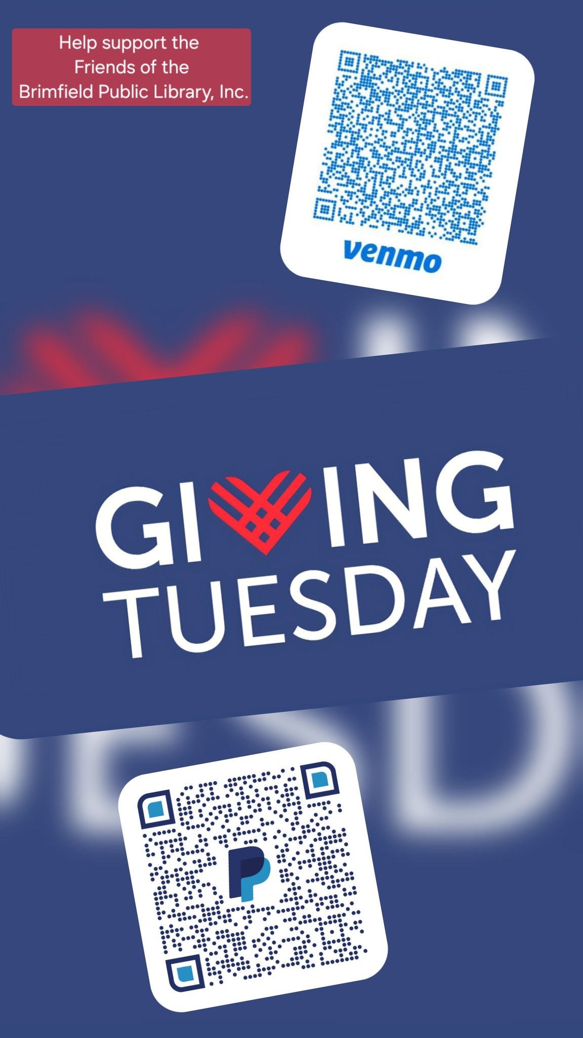 Please consider supporting the Friends of the Brimfield Public Library with a donation on Giving Tuesday (12/2). Donations may be mailed to: P.O. Box 163 Brimfield, MA 01010, delivered in person to the library or made via PayPal or Venmo. GivingTuesday is a global generosity movement that harnesses the power of radical generosity. Created in 2012 as a simple concept, GivingTuesday has evolved into a year-round global movement inspiring hundreds of millions of people to support organizations that resonate with them.